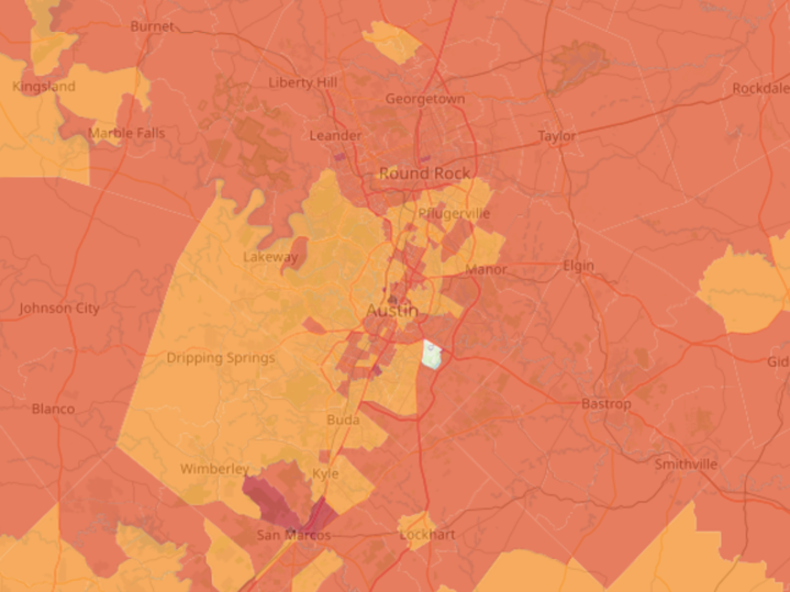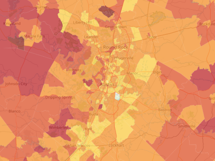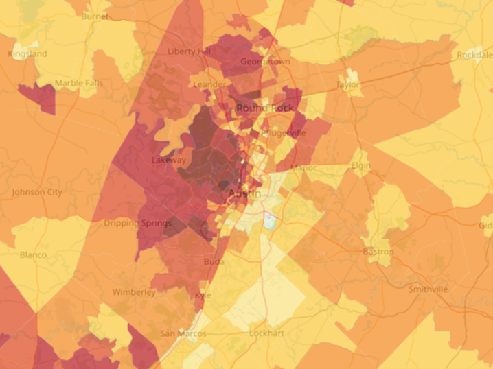 Figure 1: Sample visualizations about Austin, Texas on a census tract level from Sinc America. The variables shown are from US Census American Community Survey. Full list of Sinc America’s variables is accessible at: https://sinc.seelab.org/variables. Users can freely query location by address or by directly interacting with the map.