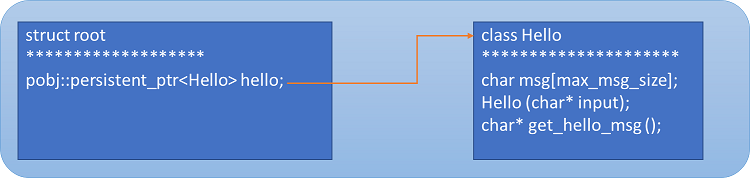 The main data structure for the “Hello” program is the root structure, which has a persistent pointer to a Hello class object.