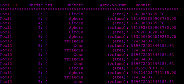 On the results screen, you can see that each thread accesses a persistent-memory pool. Also, each thread runs multiple times depending on the value of num_itr. The results screen in Figure 4, shows the pool id, thread number, iteration number, object in the pools, computation for the area/volume, and finally the result.