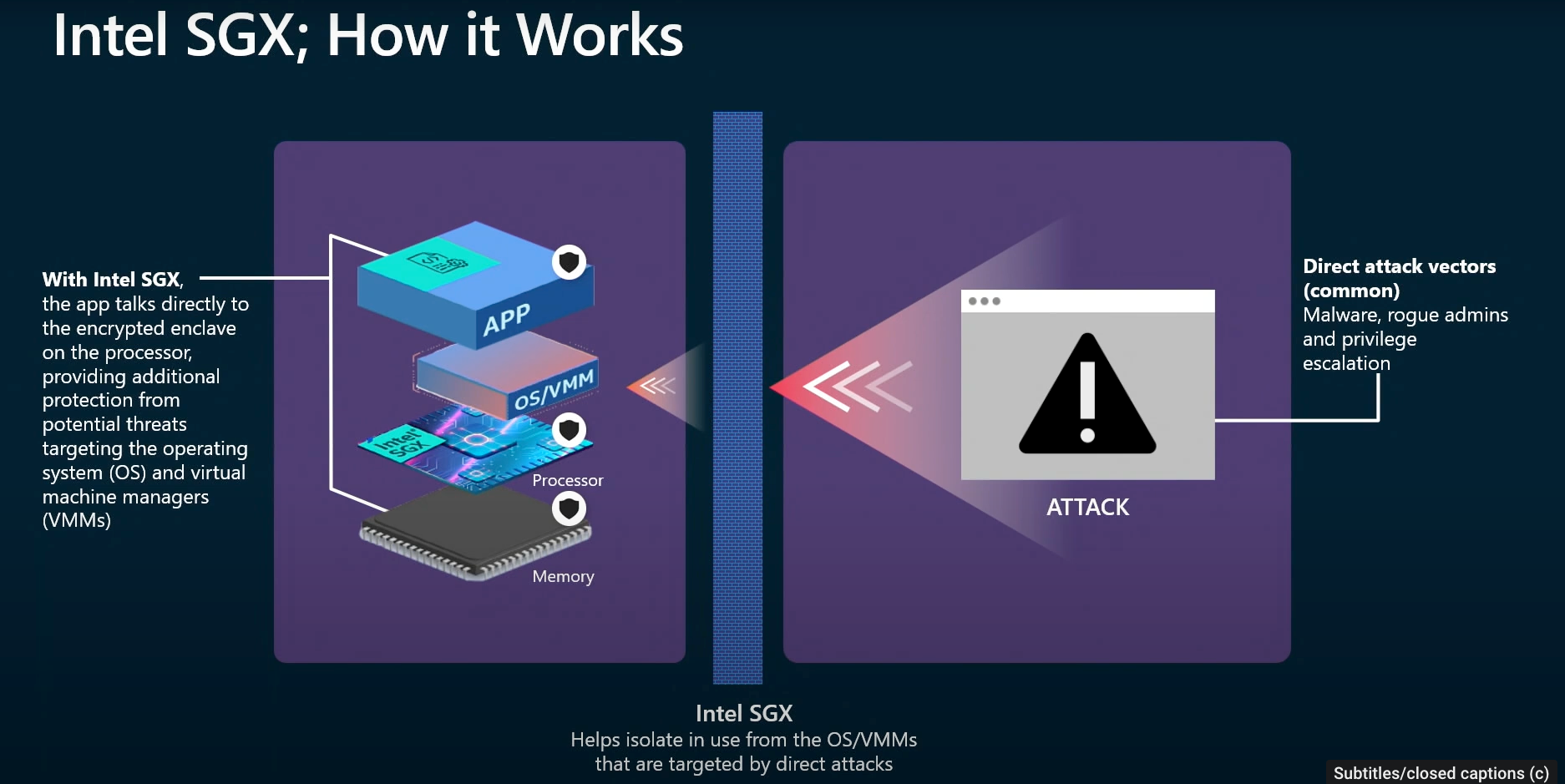 SGX is a security feature that helps protect data in use through application isolation technology. It creates secure enclaves that are fully encrypted, allowing the application to communicate directly with the CPU to encrypt and decrypt data while bypassing any intermediary layers. This protects the data from being examined or used by other code, including potentially malicious operating systems or hypervisors. SGX is available on Intel architecture and has been available in Azure for the past few years, with customers and partners using it for specialized workloads such as cryptocurrencies, secure key management, and the transfer of major digital assets in the financial space.