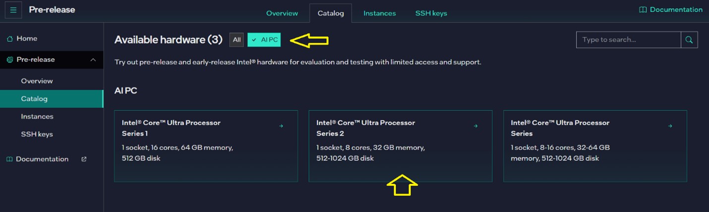 - Next to Available hardware, select AI PC to display all AI PC hardware, and then select Intel® Core™ Ultra Processor Series 2.