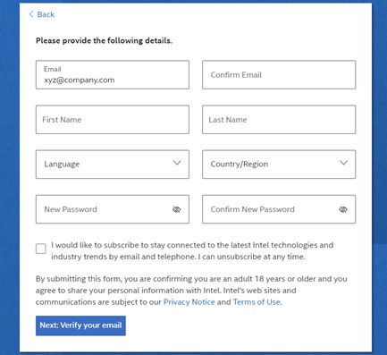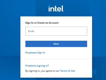 - Go to the Intel® Software Development Platform. Enter your email, and then select Next.