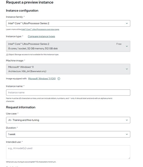 - Enter the required information, including Instance name and Use case, and then select Request instance.