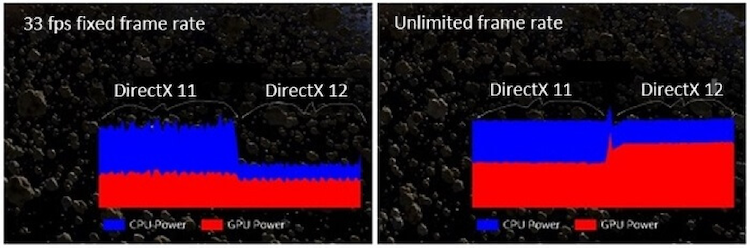 The latest graphics APIs (DirectX 12, Vulkan, and Metal 2) can dramatically reduce CPU overhead, resulting in lower CPU power consumption given a fixed frame rate (33 fps), as shown on the left side in Figure 7. When unconstrained by frame rate the total power consumption is unchanged, but there is a significant performance boost due to increased GPU utilization. See the Asteroids* and DirectX* 12 white paper for full details.