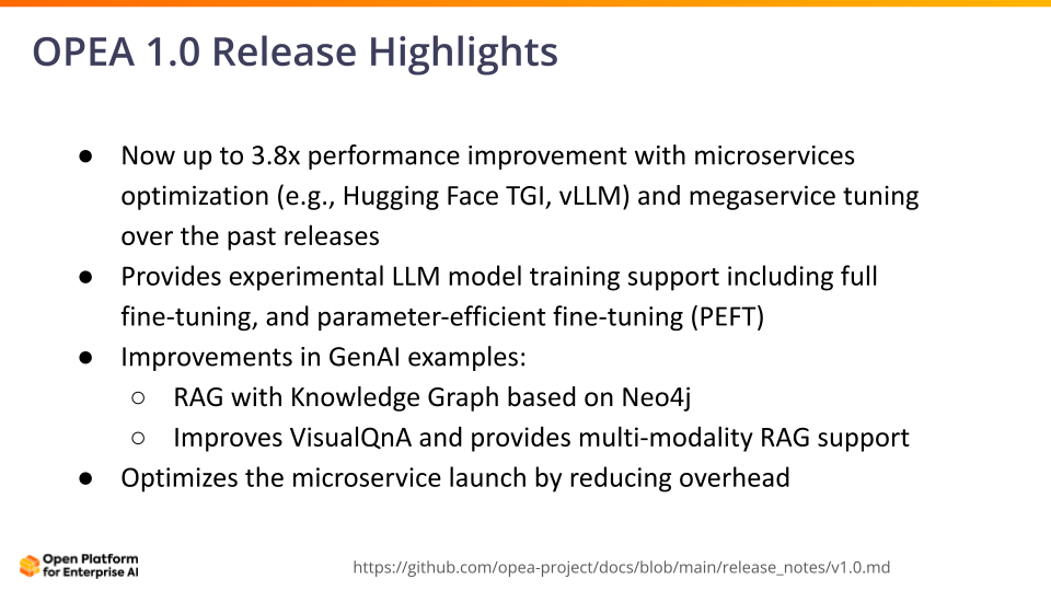 All examples in OPEA 1.0 are fully compatible with Docker and Kubernetes, supporting hardware platforms such as Intel Gaudi and Intel Xeon, and NVIDIA GPU, that are running on-prem or in the cloud, ensuring interoperability, flexibility, and efficiency in GenAI adoption. More details of the monthly releases, including OPEA 1.0, are available here.