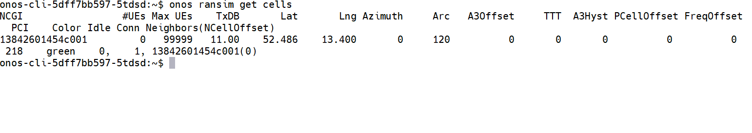 kubectl exec -it <onos-cli-pod> -n smartedge-apps -- /bin/bash onos ransim get ueCount - This shows 1 onos ransim get ues - This show 1 UE with its RRC states onos ransim get cells - This shows 1 cell with the TxDB, Neighbours exit
