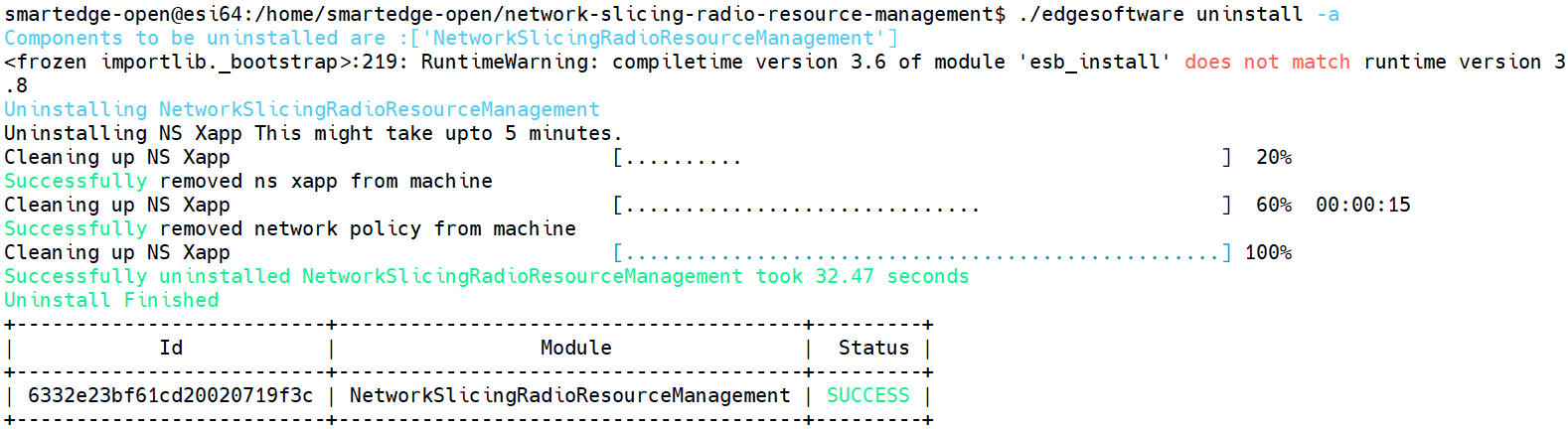 NOTE: Installation logs will be available at: //var/log/esb-cli/Network_Slicing_Radio_Resource_Management_1.0.0/NetworkSlicingRadioResourceManagement/install.log