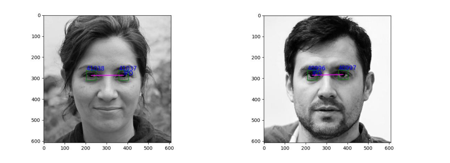 As an illustration of this application, we used it to train for the measurement of inter-pupil distance (IPD) of people's faces. This is needed to prepare eyeglasses so the center of focus of the lenses is centered on each eye. Here are two example images that were inferred: