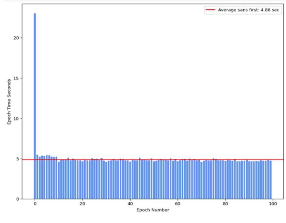 We conducted a test on the object detection neural network using 40 annotated images all 608 high and 608 wide, with 100 epochs of training. The first epoch consumes a significant amount of time as it includes model loading. We focus on the time required to process each image in every epoch as our key performance indicator. This KPI possesses the ability to scale for a variable number of epochs, and our empirical data provides estimates for the time needed to process different image sizes. Owing to these factors, we disregard the time of the first epoch, concentrating instead on the time required to process each image for one epoch. This resulted in an average time per epoch that amounted to 4.878 sec.