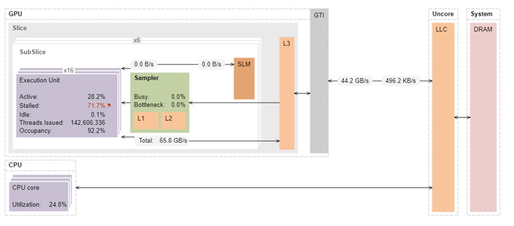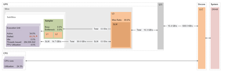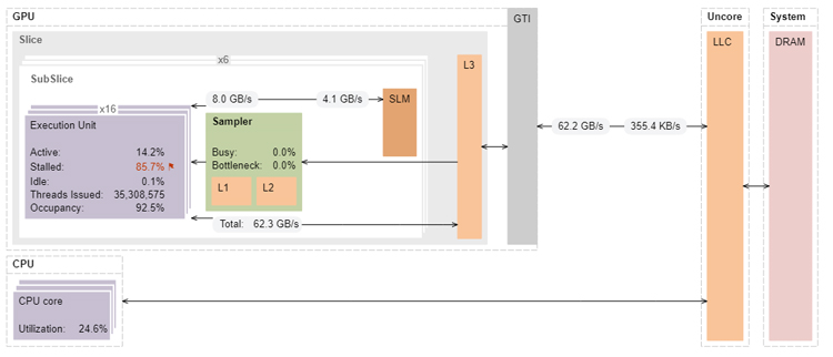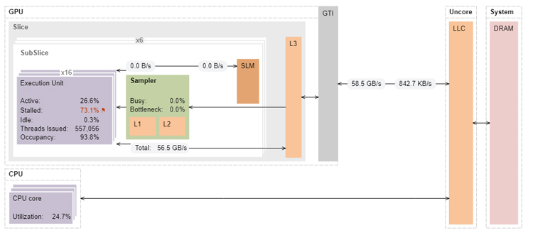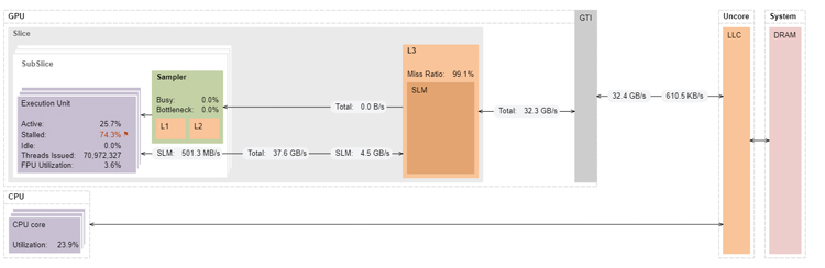VTune Profiler’s annotated architecture diagram shows that the 9th generation Intel GPU has significant headroom in terms of memory bandwidth (reductionAtomics1 only achieves 15.3GB/s of the 32GB/s peak) (Figure 4). The same kernel on the 12th generation GPU achieves much higher memory bandwidth because Intel Iris Xe graphics can handle more atomic memory updates than the 9th generation Intel HD Graphics (Figure 5).