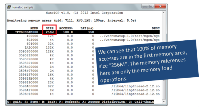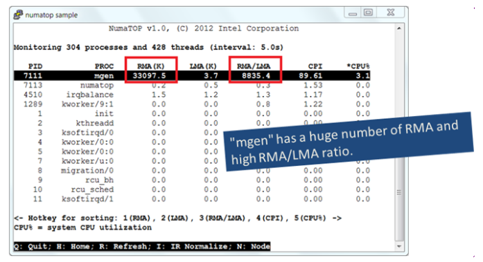 NumaTOP is a new Linux observation tool that automates these steps. Different from numastat, it is an observation tool for characterizing runtime memory locality and analyzing processes and threads running on a NUMA system. It helps you: