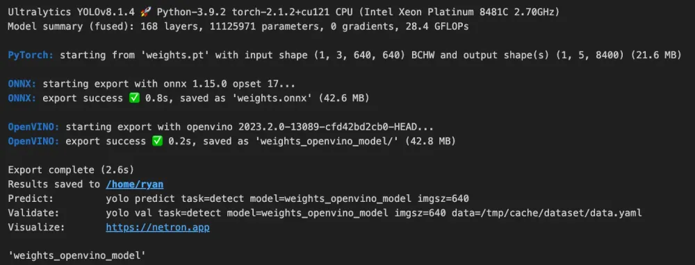 Once this is successful, you will see logs of a successful conversion and export of the model on the Intel Xeon processor.