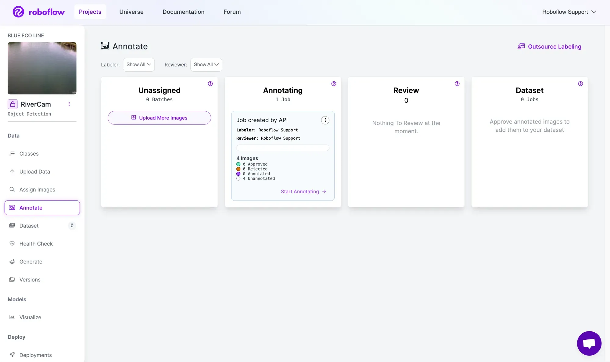 Once the images are added to Roboflow for labeling, they will show up as a job in the Annotate dashboard. Image labeling can be done by multiple people and move through an approval workflow to ensure only high-quality data is added to the dataset.