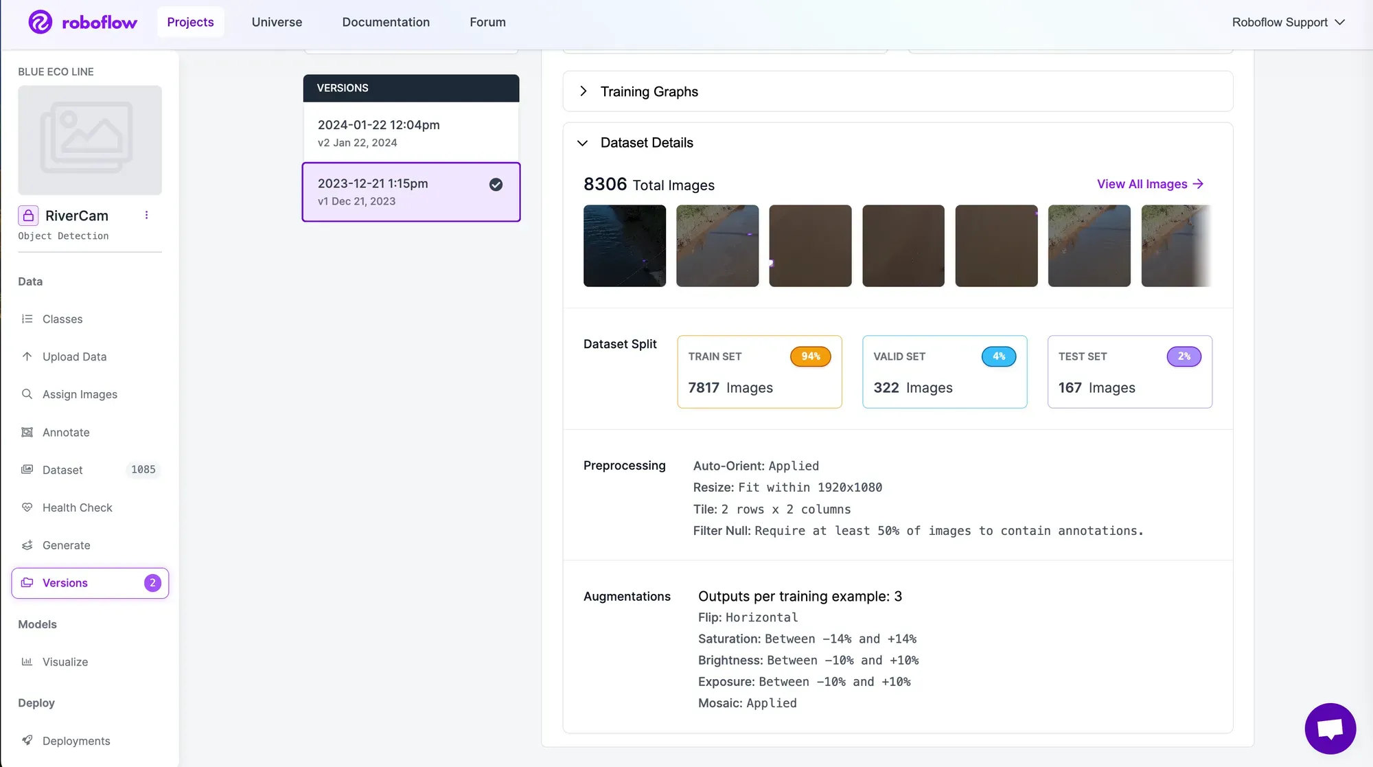 This includes adding preprocessing and augmentations such as tiling, resizing, and brightness to improve the robustness of the model. For example, tiling can improve the accuracy of detecting small objects, such as plastic, by zooming your detector in on small objects while still being able to run fast inference.
