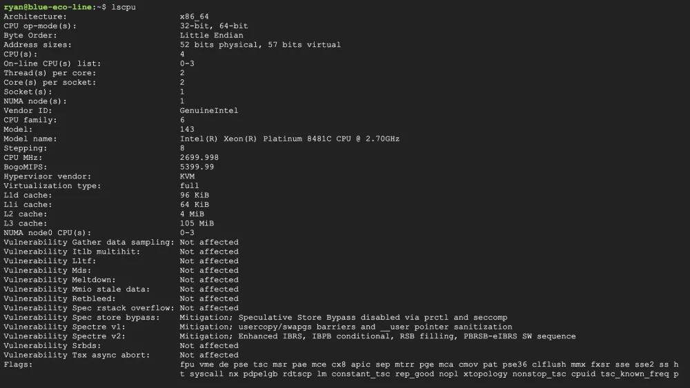Once you SSH into your virtual machine, you can see the Intel® hardware specifications below.