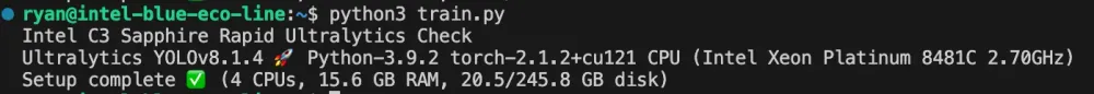Using the notebook train_c3_sapphire_rapids.ipynb, you can train a custom YOLOv8 model of your dataset utilizing the virtual machine. Then, install YOLOv8 and check the hardware specifications.