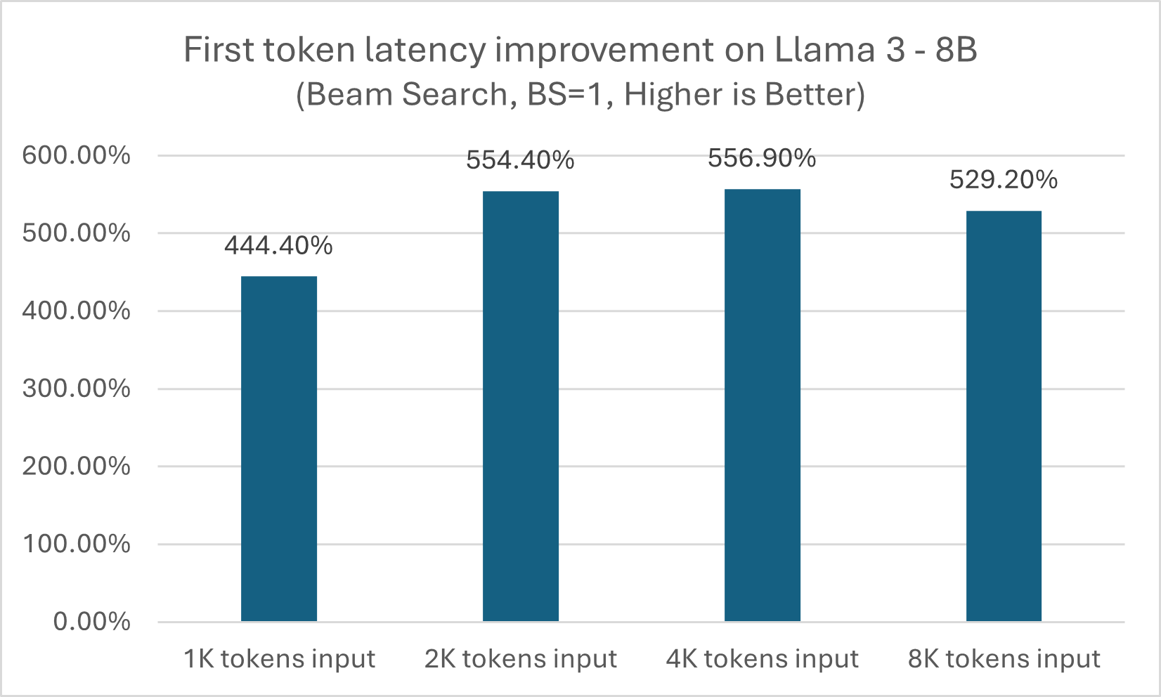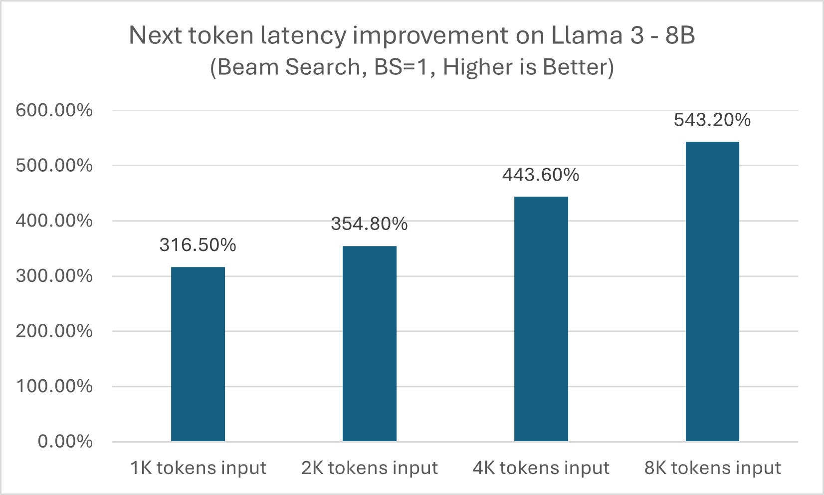 As shown in figures 1 and 2, module-level LLM optimization API can produce approximately a 5x performance boost across different input token sizes, while for next token latency, the benefit grows when size increases from 3x on a 1K token input to more than 5x on an 8K token input.