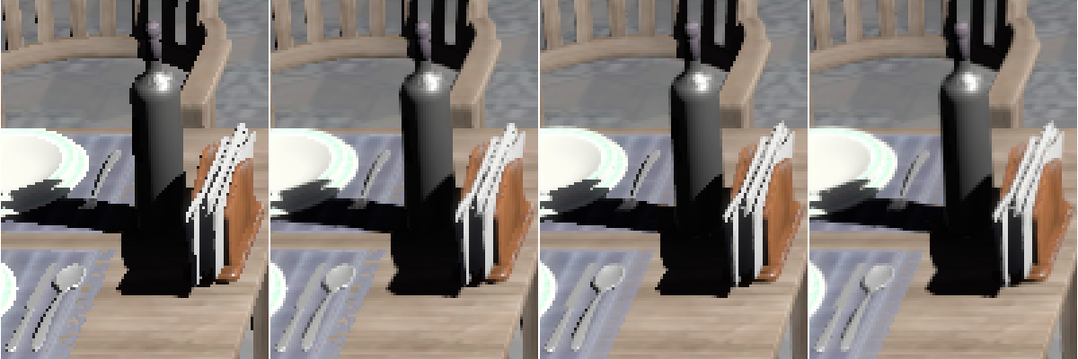 Figure 1. On the left, the image with no anti-aliasing enabled. Second image shows CMAA2 applied alone. Third image is 8xMSAA alone, showing better subpixel AA on the napkin holder and other geometry than the second, but no AA on shadows. On the right is 4xMSAA+CMAA2 providing better AA compared to 8xMSAA alone, at lower overall computation cost.