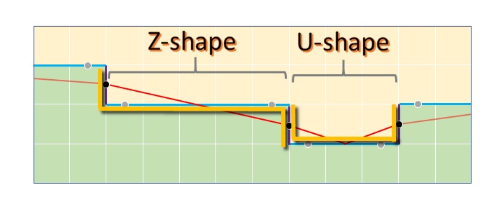CMAA2's Z-shape transition from one row or column to the next is always one pixel in height and width, while the arms are extending as long as it can walk an unbroken color edge on the sides, with the additional constraints that the length of one arm is never larger than the length of the other multiplied by a constant value, for example 1.2, 1.3, or 2, and they always have a combined length of at least 4 pixels.