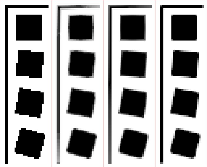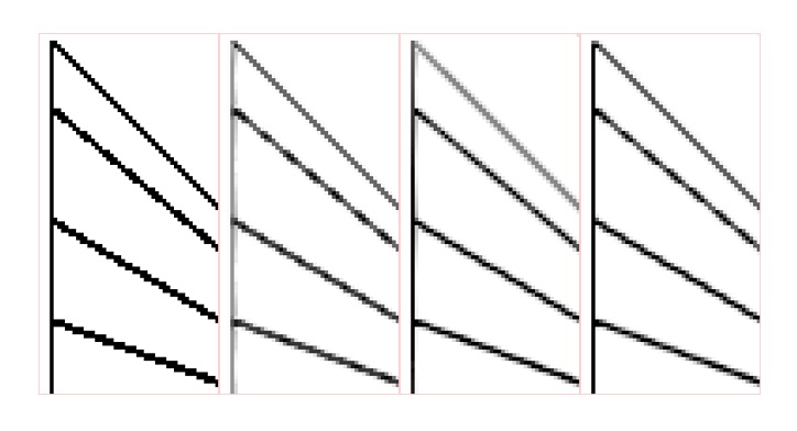 Figure 11. Handling of diagonals, from left: source image, FXAA 3.11, SMAA, CMAA2