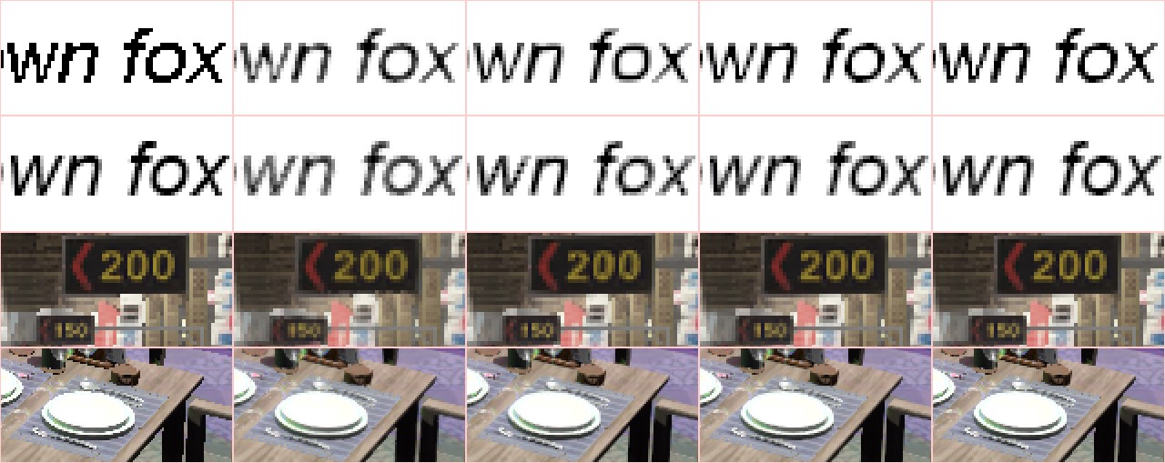 Figure 12. Sharpness vs anti-aliasing; from left: source image, FXAA 3.11, SMAA, CMAA2, CMAA2-ExtraSharpness
