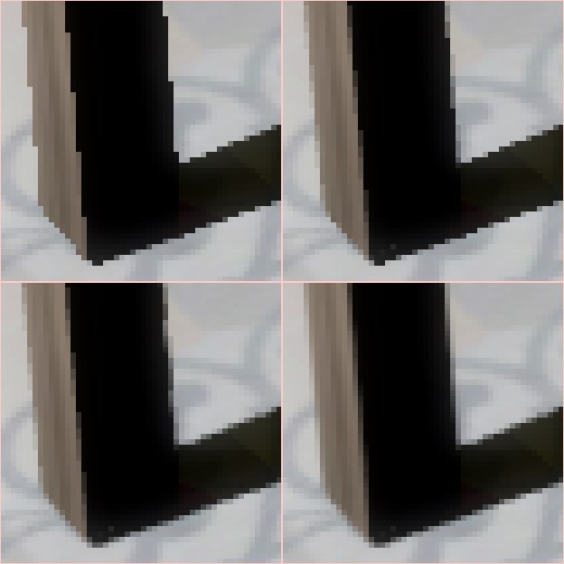 Figure 17. A zoomed in image of a table leg showing geometric and shader-based aliasing. The geometric aliasing is along the leg itself, and the shadow demonstrates the shader-based aliasing. Top-left: no AA; top-right: 4xMSAA; bottom-left: 4xMSAA+CMAA2 applied sequentially (the obvious approach); bottom-right: 4xMSAA+CMAA2 applied per-plane (a more visually correct approach)