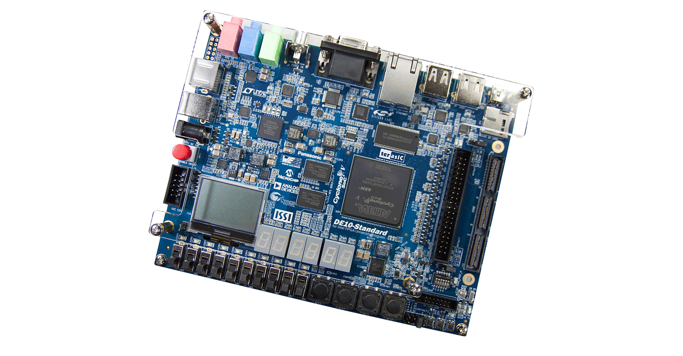 The DE10-Standard board has the same feature set as the DE1-SoC board but with some enhancements: a larger FPGA, more memory, an HSMC high-speed connector, and black & light mini LCD. It's ideal for those that need a bit more.