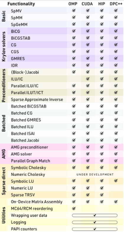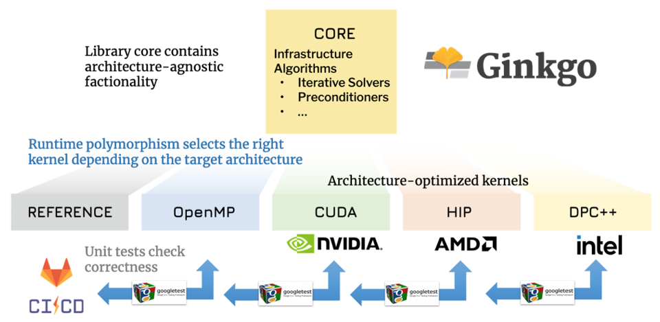 Using a universal linear operator abstraction, Ginkgo provides basic building blocks like the sparse matrix-vector product for various matrix formats, iterative solvers, preconditioners, and batched routines. Ginkgo targets multi- and many-core systems and currently features back ends for AMD* GPUs, Intel GPUs, NVIDIA* GPUs, and OpenMP* supporting architectures. The core functionality is separated from hardware-specific kernels for smooth extension to other architectures, with runtime polymorphism selecting the specific kernels. See figure 2 for details on what is available within the Ginkgo framework.
