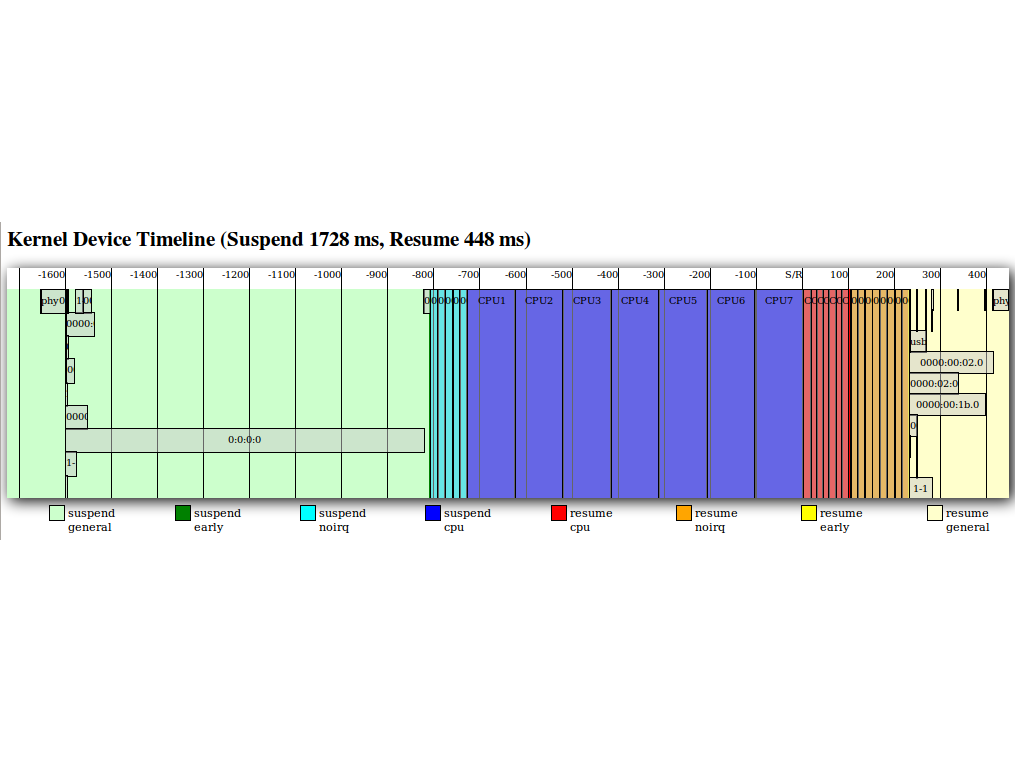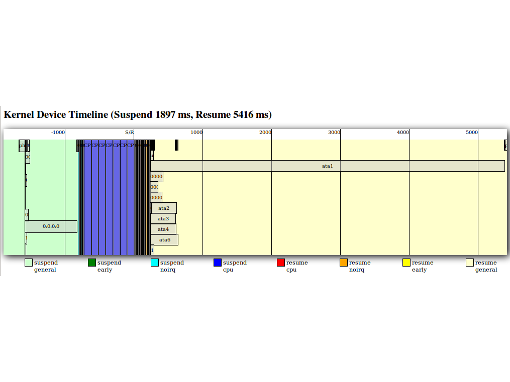 To demonstrate the massive performance improvement I've run the AnalyzeSuspend tool on three different platforms patched with the new behavior. Each is running Ubuntu* Raring with a kernel built from the upstream kernel source. There are two graphs for each of the three systems, the first shows the S3 behavior with the unaltered kernel, and the second shows the same test with the above patch applied.