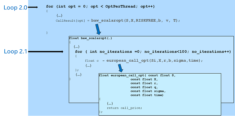 Figure 3 shows two fragments of the source code am_opt.cpp (downloaded from the link shown above), containing the two main loops in their code. The first loop initializes arrays with random values. The second loop performs the pricing operation for the number of options indicated in the variable OptPerThread, which in this case has a value of about 125 million options. In the rest of this article we will focus on Loop 2, which uses most of the CPU time. In particular, we will focus on the call to function baw_scalaropt (line 206), which performs option pricing for one option.