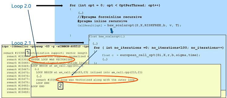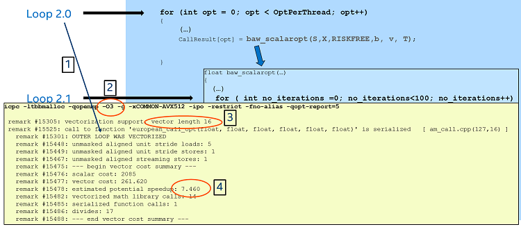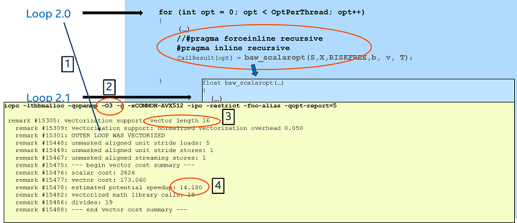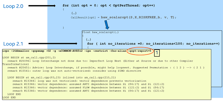 The reason seems to come from the serialized function call reported by the compiler (which refers to the call of the function european_call_opt inside the inner loop (Loop 2.1). One possible way to fix this would be to ask the compiler to recursively inline all the function calls. For this we can use the directive “#pragma inline recursive” right before the call to the function baw_scalaropt.