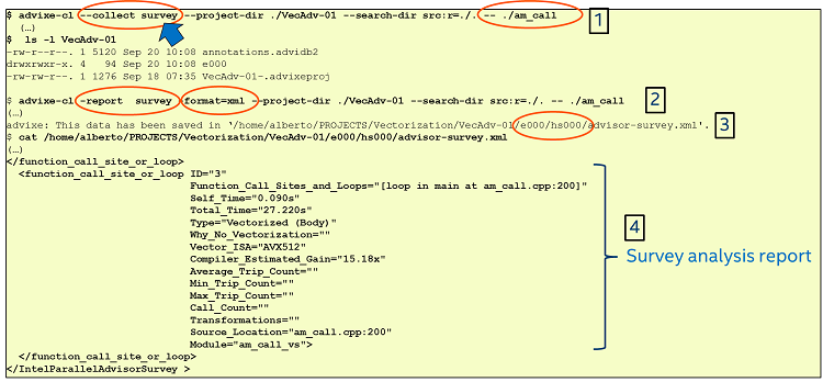 $ advixe-cl -report survey -format=xml --project-dir ./VecAdv-01 --search-dir src:r=./. -- ./am_call