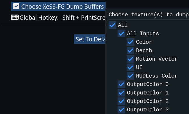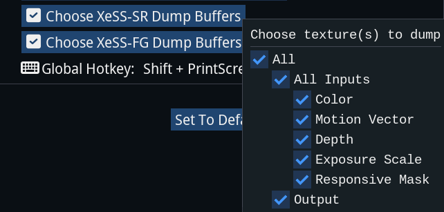 The context menus of Choose XeSS-SR Dump Buffers and Choose XeSS-FG Dump Buffers allow you to decide which texture(s) to dump: