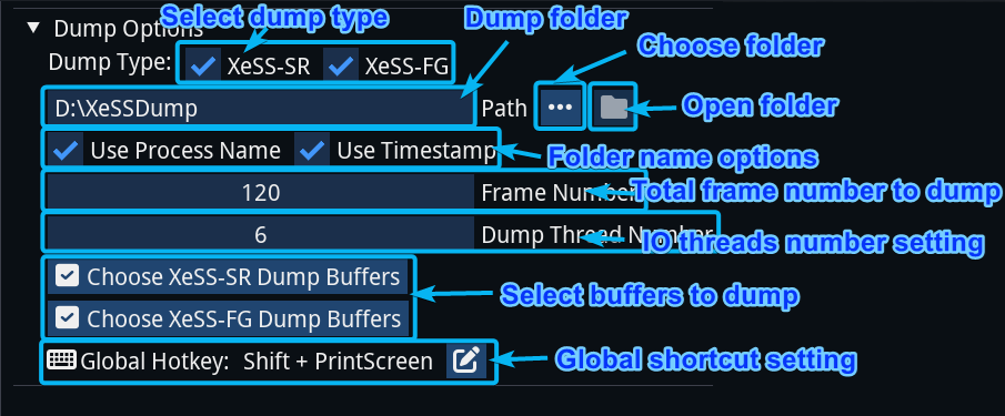 You can configure the dump settings from the Settings window by clicking the gear icon next to Dump or from the tool's menu. By default, both XeSS-SR and XeSS-FG frames will be dumped at the same time. You can uncheck them from the Dump Type options.
