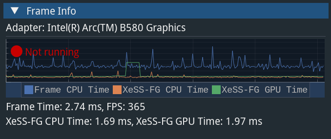 If XeSS-FG is not running, a red Not running indicator is shown, and the graph and time data of the last running frame are displayed.