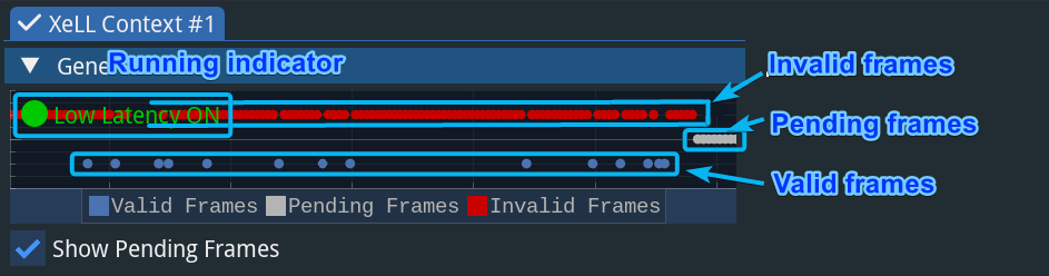 The General State is the first section of the XeLL UI. It shows running state (either Low Latency ON or Not running) and frames, as well as Sleep mode information. If XeLL is running and Low Latency Mode is on, a green Low Latency ON indicator is displayed, and all the frame dots are updated in real-time. Each dot represents one frame. If a frame is valid for the XeLL runtime, it is blue. Invalid frames are red, meaning they are not enabled by XeLL. Optionally, light grey dots can be displayed to represent pending frames that require additional subsequent frames for validity assessment.