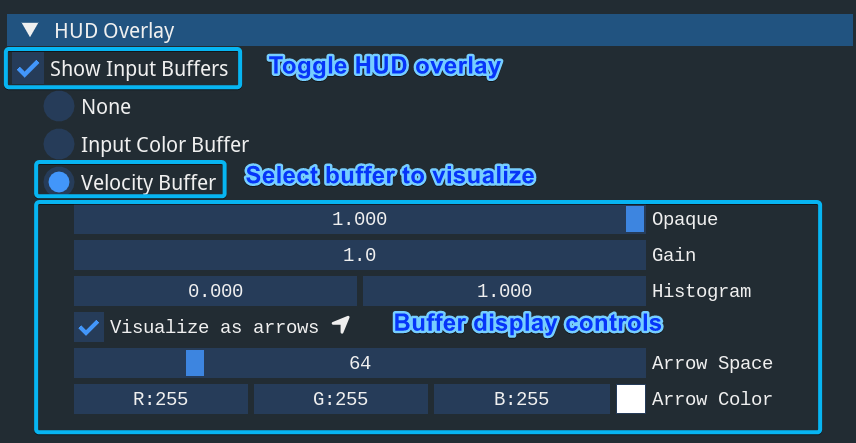 Different buffers have different controls. For example, you can choose which channel(s) to display for color buffers, while for velocity buffers, you can visualize motion vectors as arrows to check if the directions are correct.