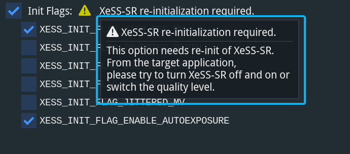 Some experiments require re-initialization from the target application, indicated by a yellow warning icon. Depending on the integration, you could select a different quality level or perform similar operations from within your application to initiate re-initialization. For a successful override, it's important to ensure that the context is not re-created throughout the process.