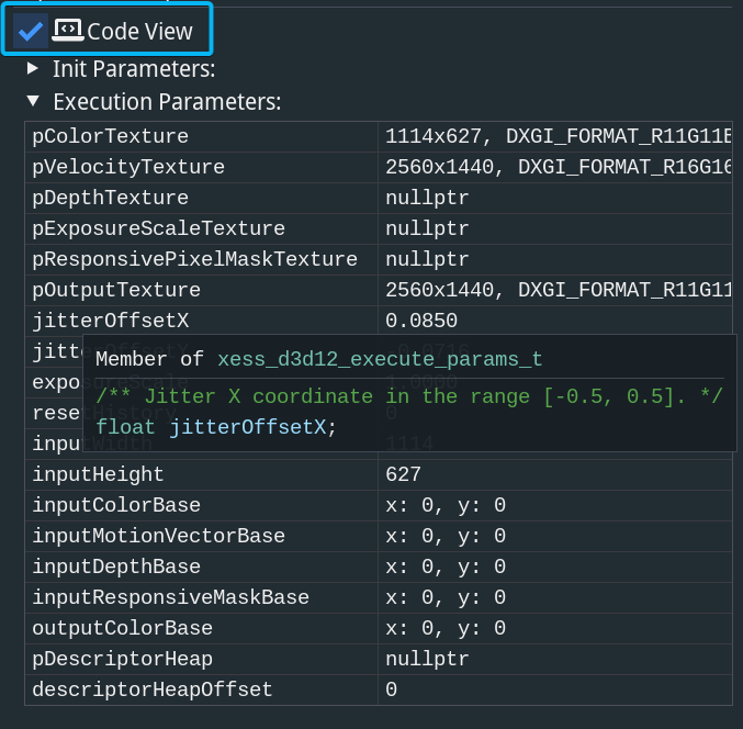 The Code View option is also available for XeSS-FG to give you a programmer's view of the parameters.