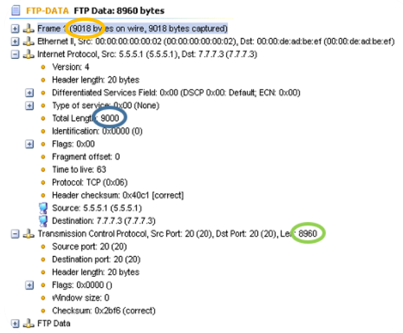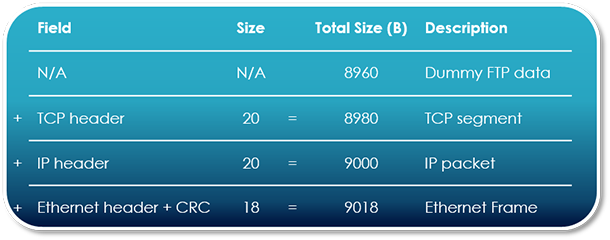 9018B frames are used during testing. Note the IP packet size of 9000B and the data size of 8960B, as described in Figure 6; they’ll be important later on during testing.