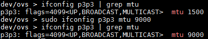 Network devices (netdevs) generally don’t support jumbo frames by default but can be easily configured to do so. Jurisdiction over the MTU of traditional logical network devices is typically beyond the remit of OvS and is instead governed by the kernel’s network stack. A netdev’s MTU can be queried and modified using standard network management tools, such as ifconfig in Linux*. Figure 1 illustrates how ifconfig may be used to increase the MTU of network device p3p3 from 1500 to 9000. The MTU of kernel-governed netdevs is subsequently honored by OVS when those devices are added to an OvS bridge.
