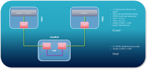 This section demonstrates the performance benefits of jumbo frames in OVS DPDK. In the described sample test, two VMs are spawned on the same host, and traffic is transmitted between them. One VM runs an iperf3 server, while the other runs an iperf3 client. iperf3 initiates a TCP connection between the client and server, and transfers large blocks of TCP data between them. Test setup is illustrated in Figure 15.