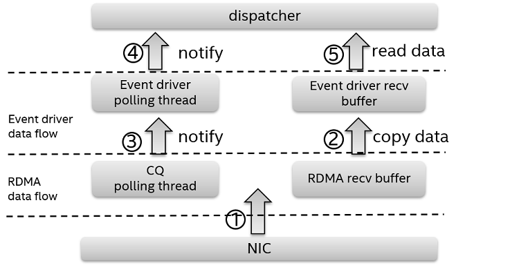 To better understand the overhead inside Ceph async messenger with iWARP RDMA, we looked at the message receiving flow.