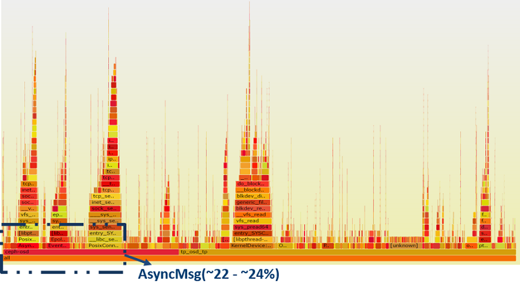 The RDMA message transfer process is based on Ceph async messenger. For one message receiving flow, two events are triggered and one message copied. We go deeper and use a perf flame graph to get the details of CPU usage for one async messenger worker.