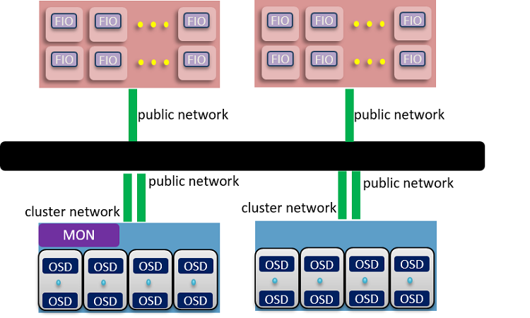 - Network configuration: The network module between OSD nodes and client nodes was user defined. In this test, we changed the network module from TCP/IP to RDMA. The networking topology is described in Figure 5. For Ceph with RDMA testing, the public network and cluster network shared one NIC.