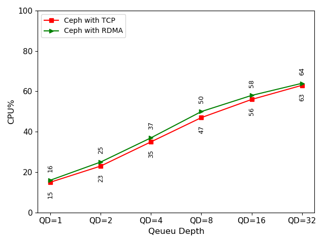 Therefore, we expect lower CPU overhead and lower network message latency when integrating RDMA into the Ceph network component.