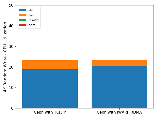 At the 2017 Boston OpenStack Summit3, Intel presented an Intel Optane SSD and Intel® SSD Data Center P4500 Series based Ceph all-flash array cluster that delivered multimillion input/output operations per second (IOPS) with extremely low latency and competitive dollar per gigabyte costs. We also showed the significant networking overhead imposed by network messenger. As shown in Figure 2, the CPU tended to be the bottleneck in a 4K random read workload. Analysis showed that 22–24 percent of the CPU was used to handle network traffic, highlighting the need to optimize the Ceph networking component for ultra-low latency and low CPU overhead. Traditional TCP/IP cannot satisfy this requirement, but RDMA can 4.