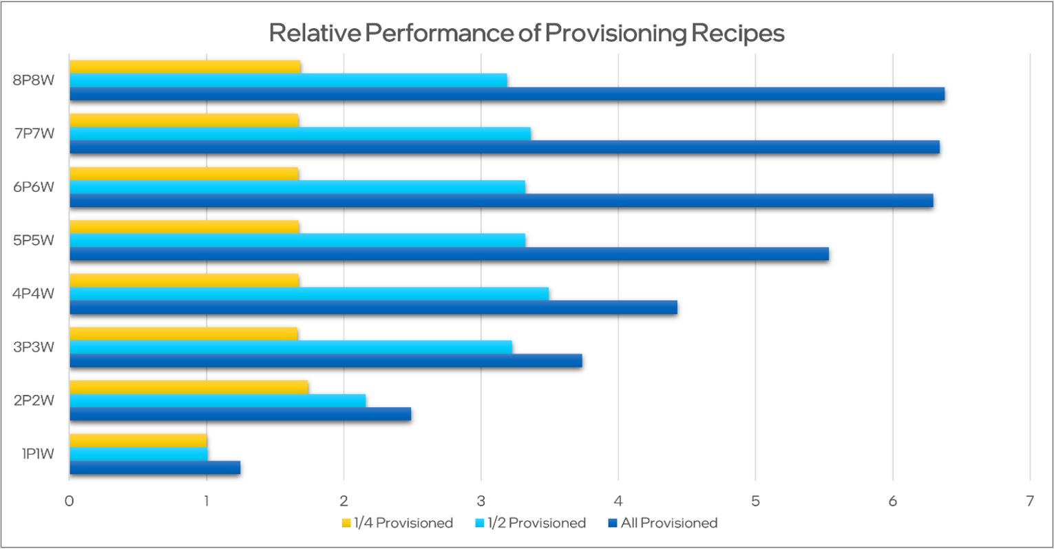 The following graph of data from the DPDK test environment illustrates the effectiveness of the recipes in distributing resources in different producer/worker scenarios. The labels indicate the number of producers and workers (for example, “8P8W” represents eight producers with eight workers).