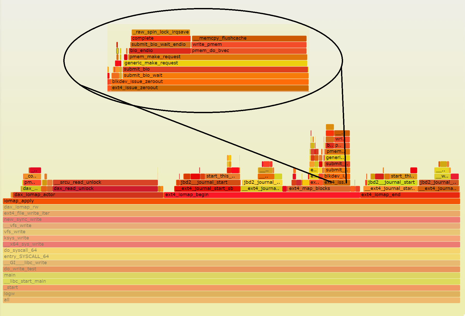 If we divide the time spent on the function iomap_apply() between time spent writing data—dax_iomap_actor()—and time spent handling metadata—ext4_iomap_begin() and ext4_iomap_end()—we can see that we spent 32.8% in the former and 64.6% in the latter. Better than before, but still not ideal.