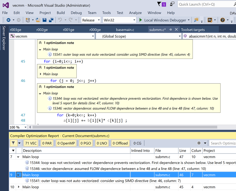 Figure 2 shows a screen capture of the compiler optimization reports within Visual Studio*. On Linux, the submm.optrpt file has the same information (make sure you used -qopt-report=3). The compiler reports show that the loop is not vectorized and further explains that it did not vectorize the inner loop because it could not determine the independence of all variables being operated on. The report also suggests the developer consider adding a directive or pragma for the compiler to inform the compiler that there are no dependencies.
